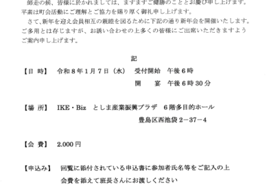 新年を迎え会員相互の親睦を図るために『新年会』を開催いたします 今回は、毎年利用のリビエラ閉店に伴い、IKE・BIzの多目的ホールを使用いたします 回覧でご案内し、支部長・班長を介しての申し込みになります 回覧されない等ご不明な点は当ホームページのお問い合わせ欄よりご質……