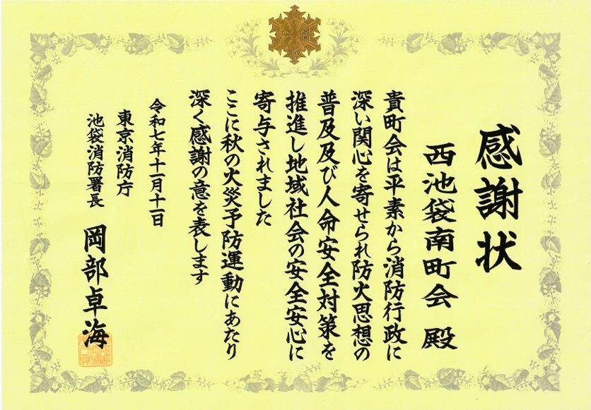 秋の火災予防運動の取り組みに対し、池袋消防署より感謝状をいただきましたので披露いたします